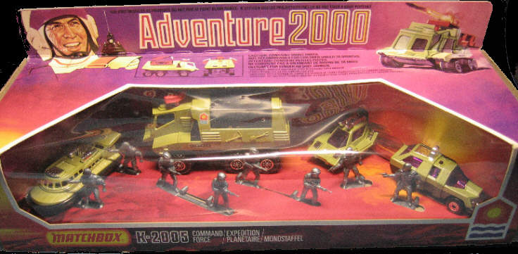 1978 wurde mit einer Vision auf das Jahr 2000 aufmerksam gemacht: "Das Jahr 2000 bedeutet Abenteuer. Die Planeten bereiten sich auf einen Kampf vor." So warb man damals für diese Action-Fahrzeuge in Super Kings Größe - die Adventure 2000 Serie. Es gab zunächst 5 Modelle (avacado / olivgrün). 1979 gab es noch eine Großpackung mit 3 Superfast-Modellen. Ein Jahr später folgte noch das letzte Modell "Shuttle Launcher" in blaumetallic. Dieses Modell ist heute sehr schwer zu bekommen. Betrachtet man sich den 1980er Katalog genauer, so erkannt man, dass der "Shuttle Launcher" nicht abgebildet ist, dafür aber alle anderen Modelle in blaumetallic. In dieser Farbe sind diese Modelle jedoch nie erschienen.  |