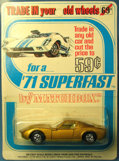 Ab 1971 ging es dann los mit Rennstrecken aller Art. Im 1971er Katalog wurde mit 16 Seiten auf dieses Zubehör aufmerksam gemacht. Es gab Rennstecken mit Loopings, Sprung durch Feuerreifen, Sprungbrücken, Beschleuniger, Straßenweichen, Rundenzähler usw. Die Teile besaßen gewisse Eigenschaften, die jetzt auch auf den Schachteln der Matchbox-Autos zu finden waren. So konnte man genau erkennen, ob ein Modell für Handbeschleuniger oder Superbeschleuniger geeignet war. Um die Superfast-Modelle noch schneller bekannt zu machen - und natürlich auch als Kaufanreiz, gab es für kurze Zeit in den USA die "Trade In" Blisterpackung. Man konnte ein altes Modell "in Zahlung geben". So reduzierte sich der Preis von 69 auf 59 Cent. Man warb damals: "Trade in any old car and cut the price to 59c".  |