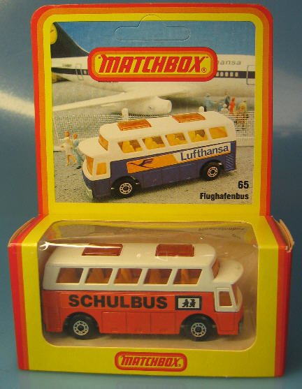 1977 wurde die "Two Packs" Reihe um Militärmodelle erweitert. Es handelte sich um Superfast-Modelle in militärischen Farben. Besonders gefragt sind TP-16 Military Dump Truck und Case Tractor in "drab olive" (schwarzoliv). Auffällig viel Augenmerk wurde in diesem Jahr auf Bausätze gelegt. Es gab Aircraft Kits, Ship Kits und Military Figures. In Deutschland erschienen in diesem Jahr (bis ca. 1981) einige Superfast-Modelle in einem besonderen Boxtyp. Diese gelben Blisterboxen ("Verpackt in Deutschland") hatten die Besonderheit, dass auf der Vorderseite ein Foto vom Modell mit einer passenden Szene abgebildet war. Auf der Rückseite gab es auch noch ein paar technische Daten (Motor, Hubraum, Höchstgeschwindigkeit usw.) und weitere Abbildungen. Ein gefragtes Modell aus dieser Zeit (1979) ist 65 Airport Coach als Schulbus in orange.  |